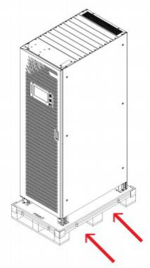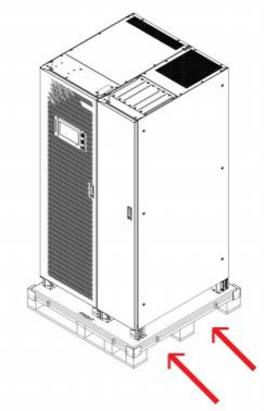 UPS 机柜较重,重量参数见表 11-3。卸货及搬运尽量使用机械搬运工具如电动叉车等 ,将设备运到距安装地点最近的 地方。用叉车卸货及运输时,请按图 2-1所示方向叉入,以防止倾倒,且运输过程中机柜倾倒角不可超过 15 度。